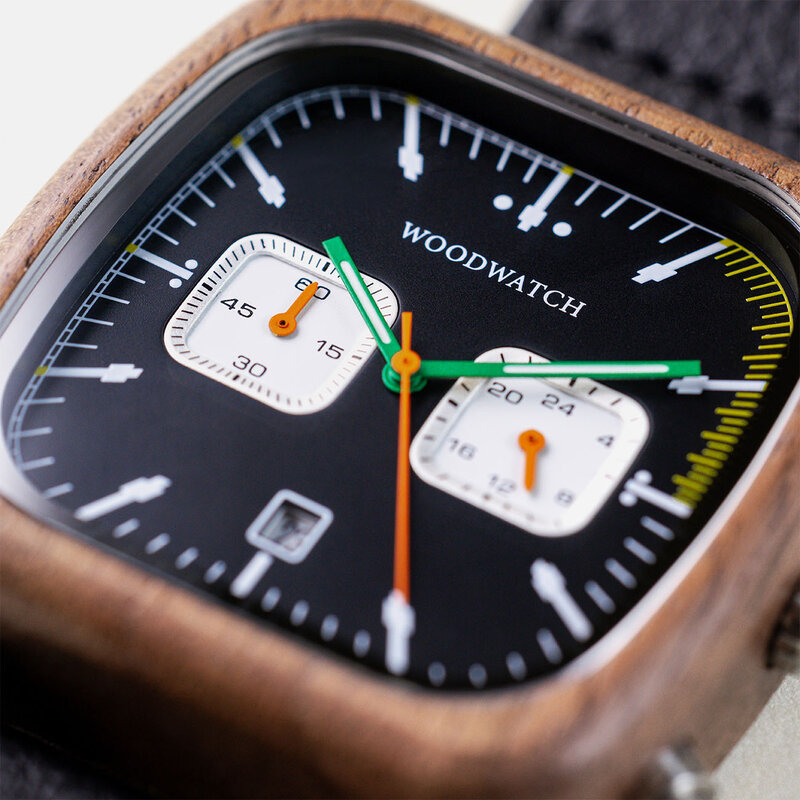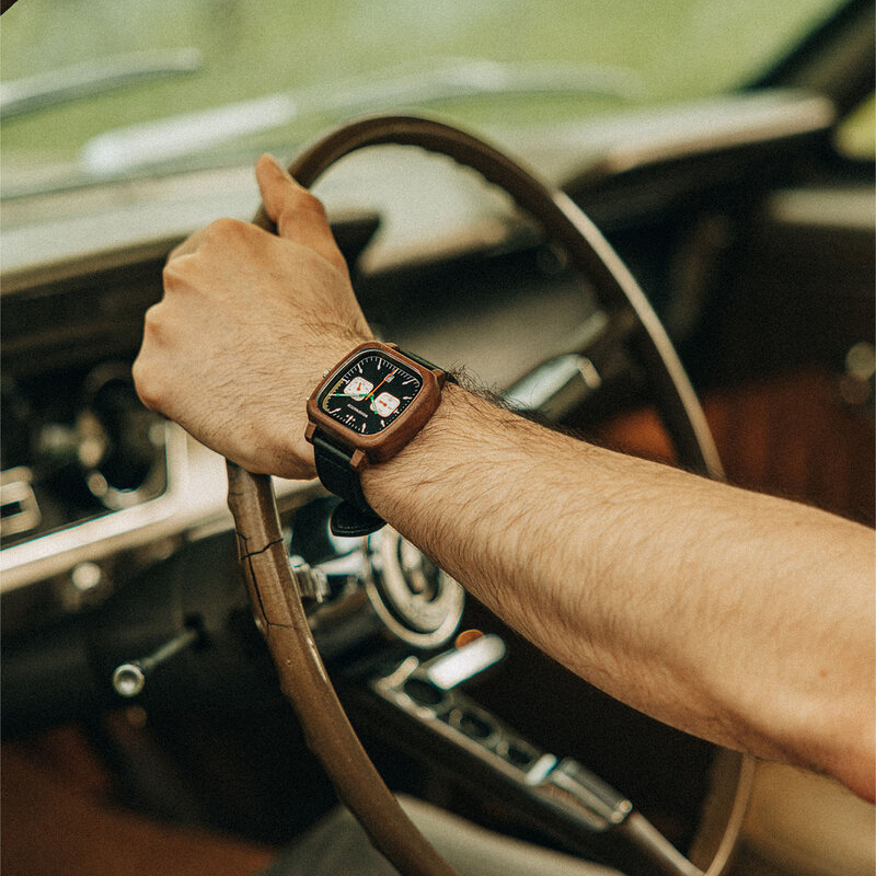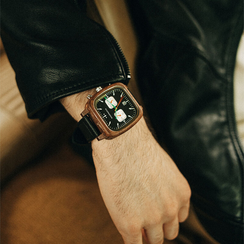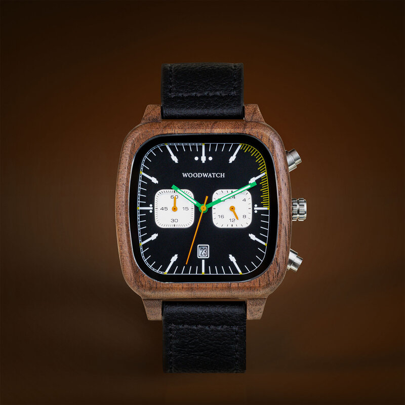 Midnight Drive ist aus Walnussholz gefertigt und hat ein schwarzes Zifferblatt.