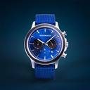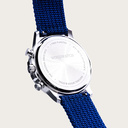The Farbound Blue is made of stainless steal and Ebony wood. It features a blue dial with silver metal details.