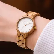 La colección AURORA transpira el aire fresco de la naturaleza escandinava y los espectaculares cielos. Este liviano reloj está hecho de madera natural de Zebra, y va acompañado de una esfera amarilla de acero inoxidable con ddetalles plateados.