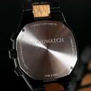 Carver è realizzato in legno di acacia e metallo nero spazzolato, con quadrante nero.