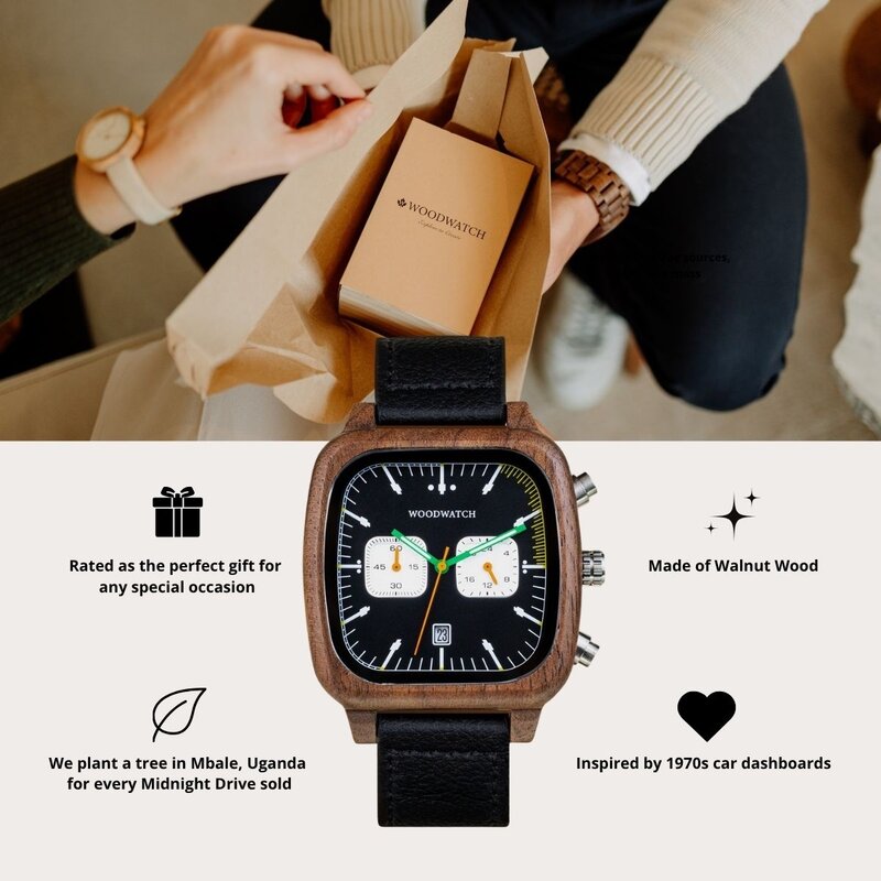 Midnight Drive is made of Walnut wood, featuring a black dial.