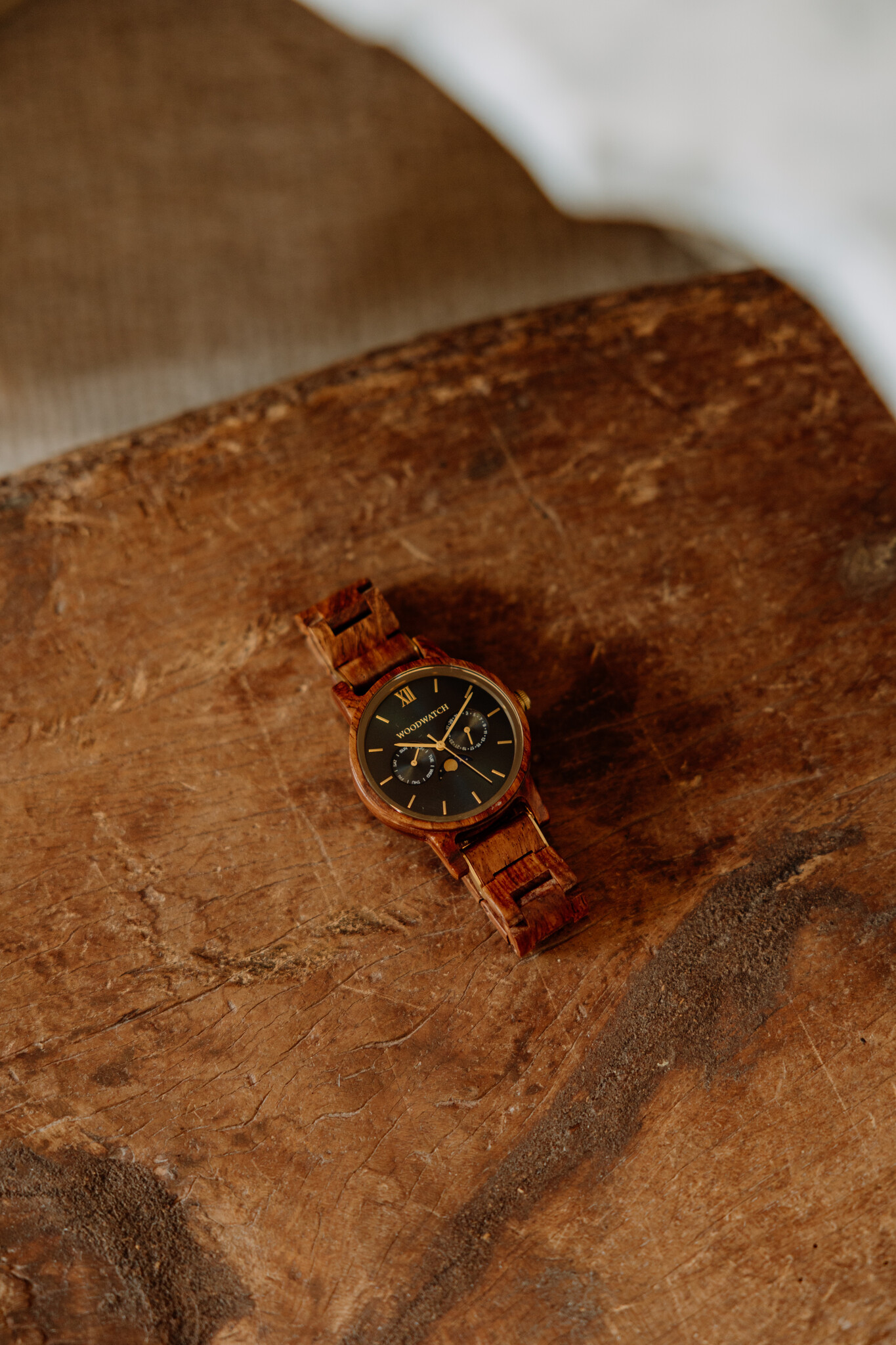 Houten horloges hebben warme tinten en natuurlijke structuren. Zwart sandelhout, walnoot of ebbenhout hebben een diepe uitstraling die goed past bij de herfst. De kleuren van hout mengen mooi met het oranje van pompoenen en de donkere tinten van Halloweennachten. Elk houten horloge heeft zijn eigen nerf, waardoor elk stuk echt uniek is.